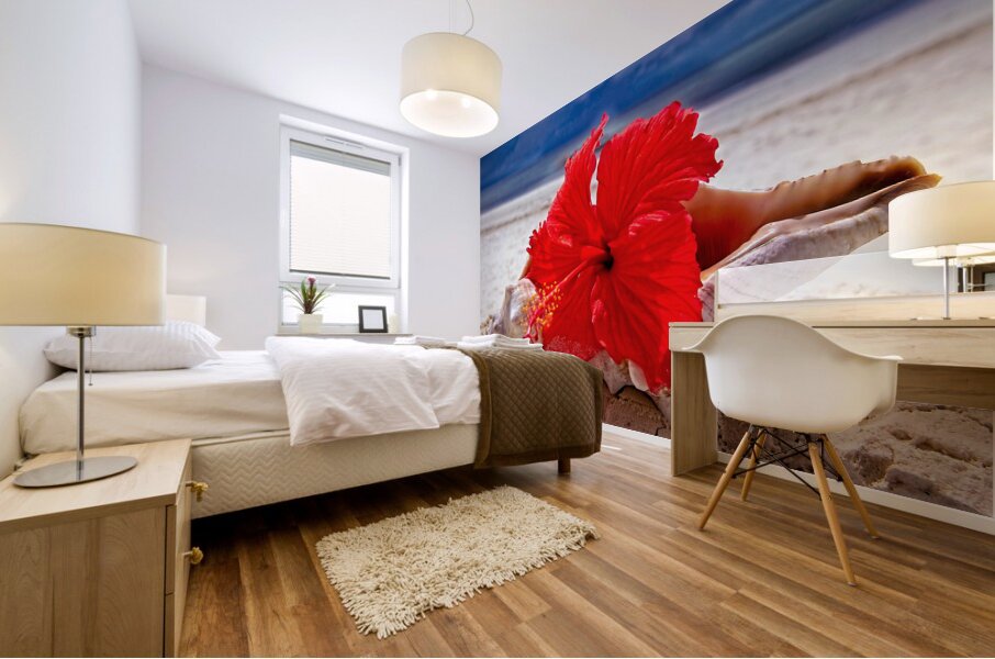 A vivid red hibiscus resting on a sculpted seashell creates a stunning contrast of textures and color. A perfect piece for beach houses, spas, or anyone who dreams of the ocean.