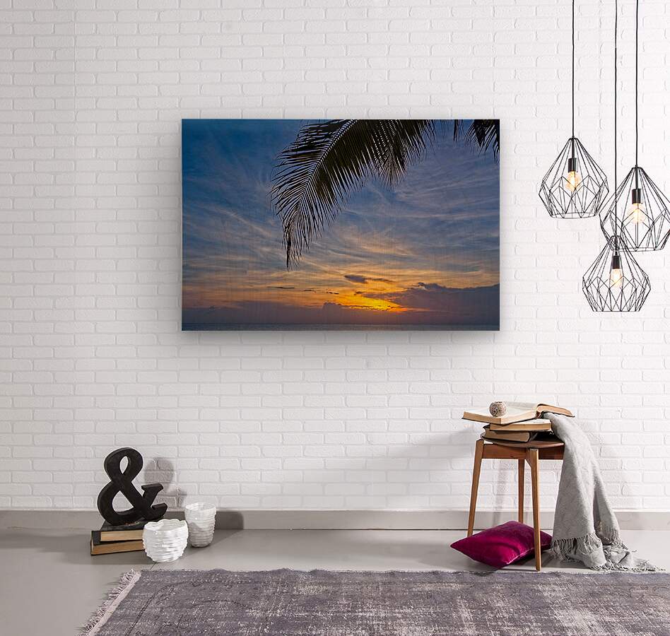 Capture the serenity of a tropical evening with this radiant sunset framed by the graceful arc of a palm leaf. Ideal for living rooms, bedrooms, or vacation homes, this piece invites relaxation and escapism.