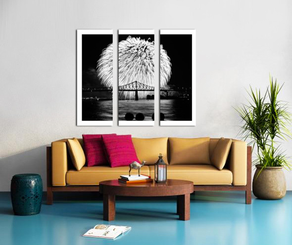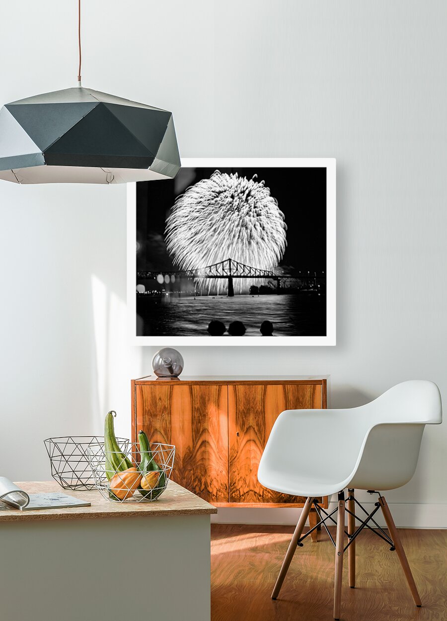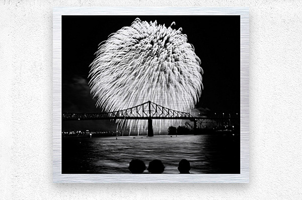 This dramatic black-and-white image explodes with excitement. The huge burst of fireworks lights up the sky above the bridge, reflecting beautifully on the water below. It’s a bold, eye-catching piece that brings a sense of celebration and wonder to any space.