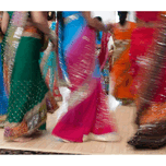 This lively scene captures the joyful motion of dancers in bright, flowing saris. The blur of movement brings the image to life, filling it with energ...[+]