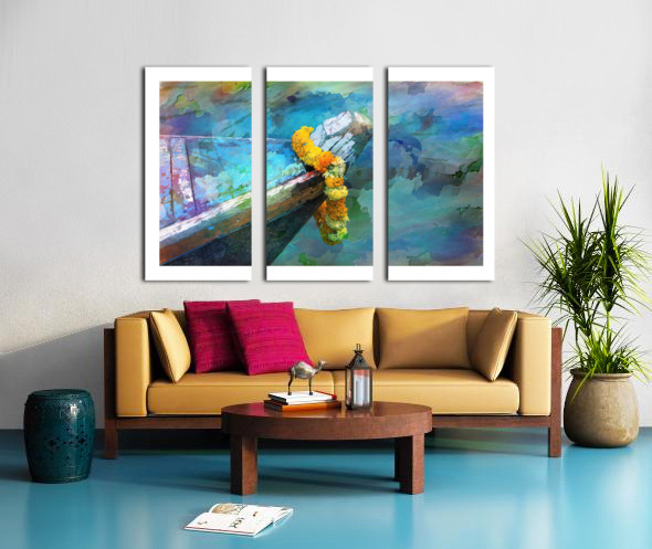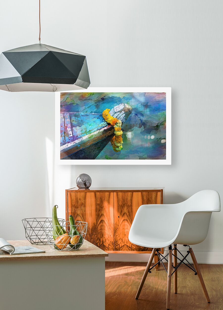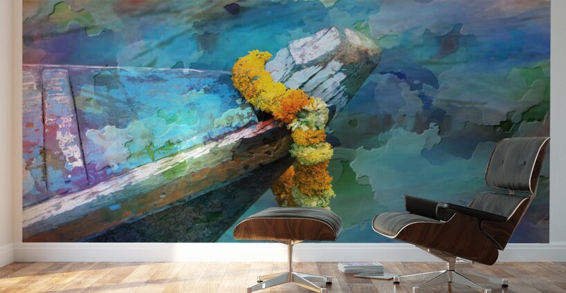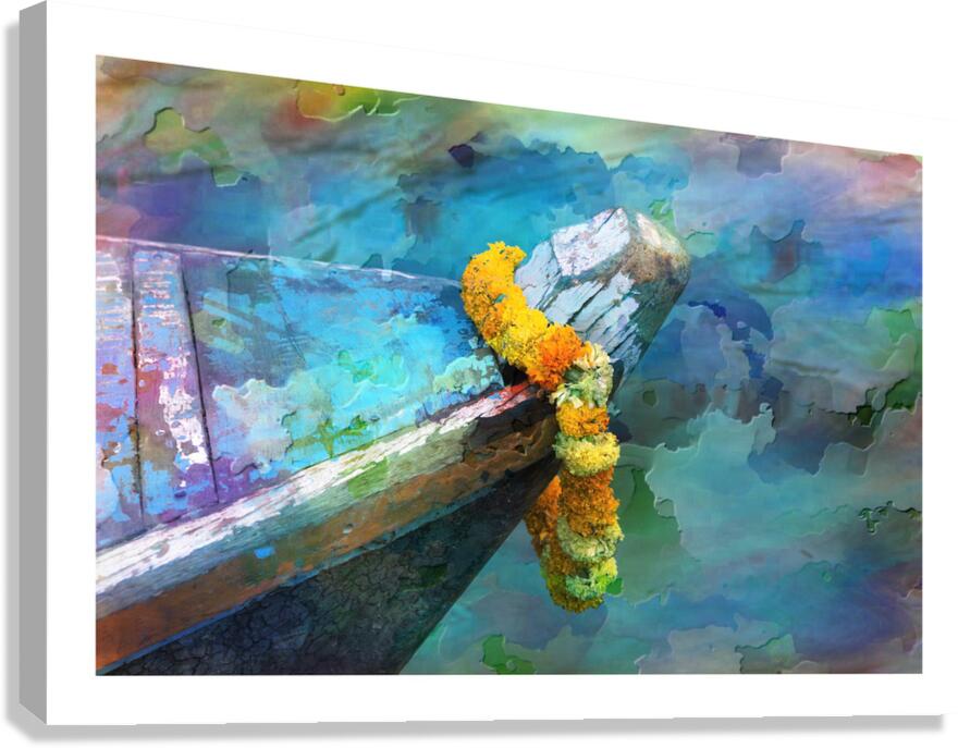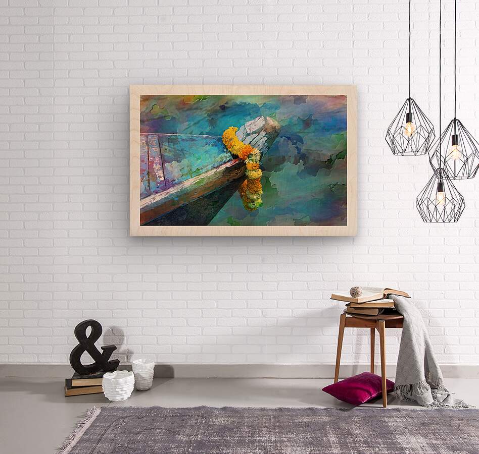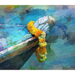 This colorful artwork blends soft watercolor textures with the worn wood of a boat’s bow. The bright flower garland adds a joyful touch, making the whole scene feel peaceful and full of life. It’s a calming, uplifting piece that brings color and serenity into any space.