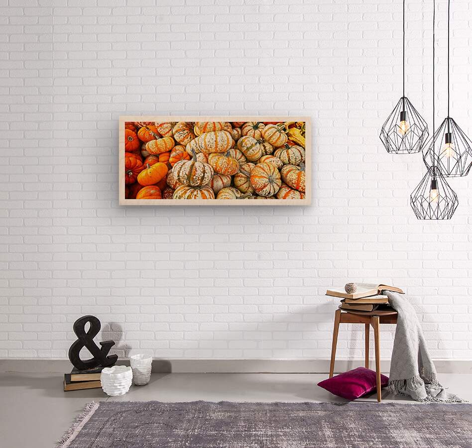 This lively scene is filled with warm fall colors and beautifully patterned pumpkins of all shapes and sizes. The mix of oranges, creams, and speckles brings a cheerful, cozy feeling to the image. It’s a bright, festive piece that adds warmth and seasonal charm to any room.