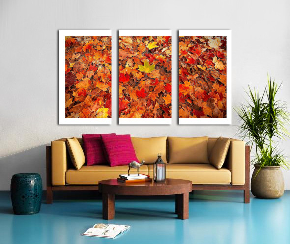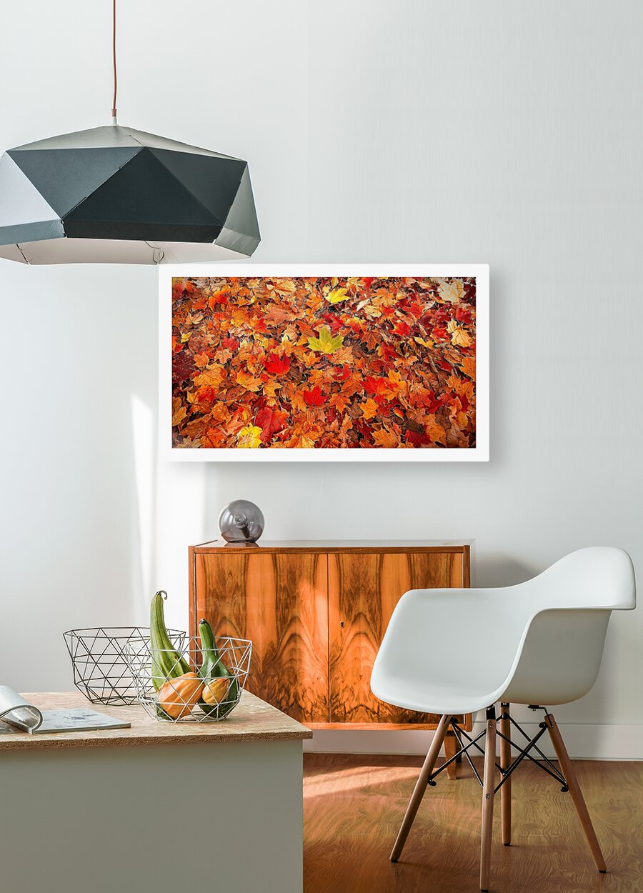 This photo celebrates fall in all its colorful glory. A blanket of vibrant leaves creates a rich tapestry of reds, oranges, and yellows with one bright leaf standing out. It’s warm, cozy, and perfect for adding seasonal charm and natural beauty to your home.