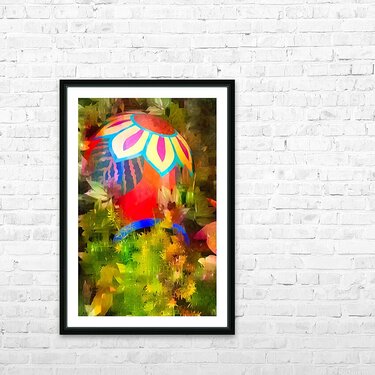 This colorful artwork blends bold patterns with soft, leafy textures to create a dreamy garden scene. The bright vase stands out beautifully, giving t...[+]