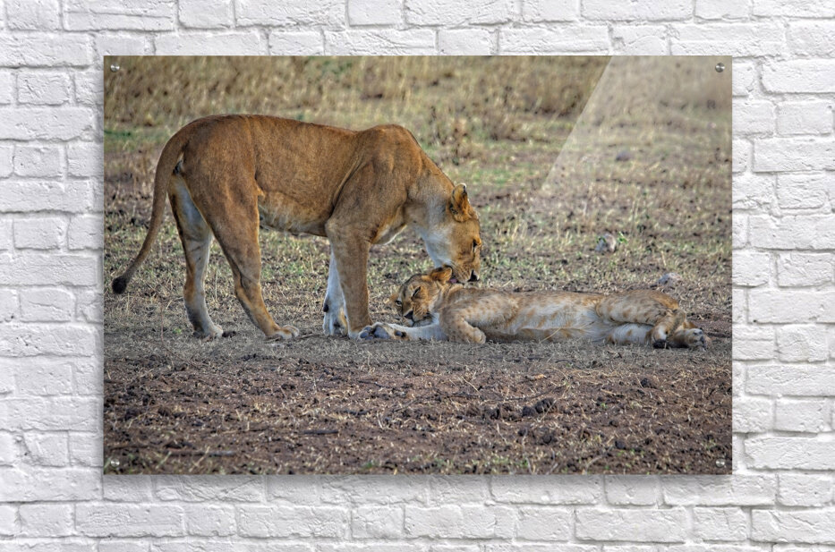 A lioness gently nudges her cub sprawled on the ground, a moment of affection wrapped in dusty savanna tones. A quiet glimpse into the tenderness behi...[+]