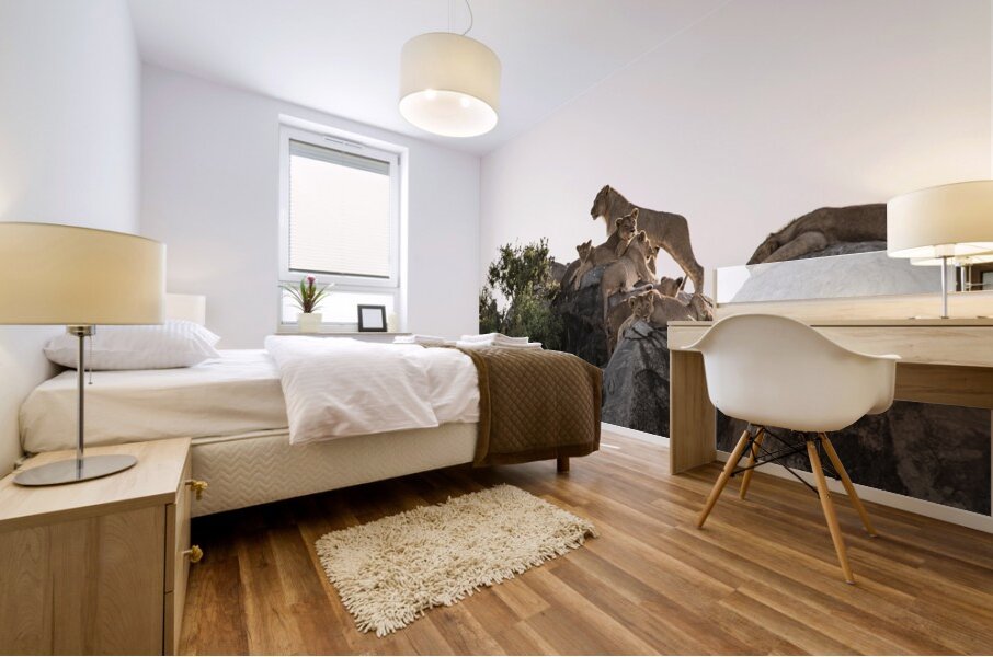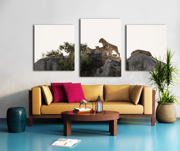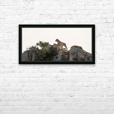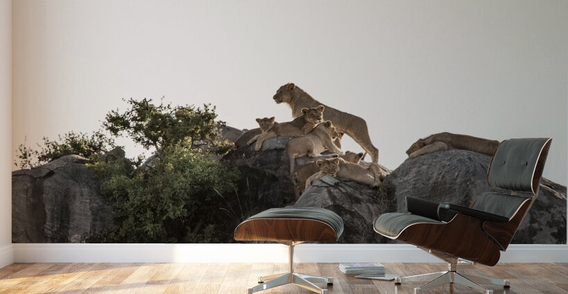 Lionesses and their young perch atop a rocky outcrop, scanning the plains below. The elevated pose resembles a natural throne overlooking the Serenget...[+]