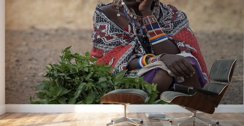A Masai woman sits beside bundles of fresh greens, adorned with colorful beadwork and traditional fabrics. Her thoughtful expression adds a narrative ...[+]