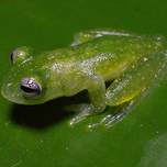 A tiny translucent green frog sits atop a glossy leaf, its skin glowing under the light. Its large reflective eyes give it an other-worldly, delicate ...[+]