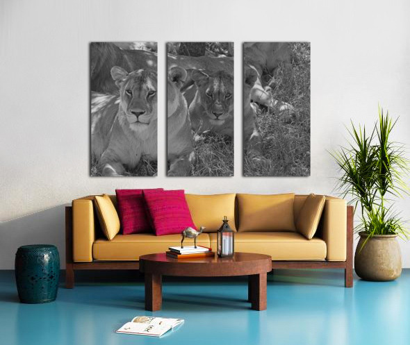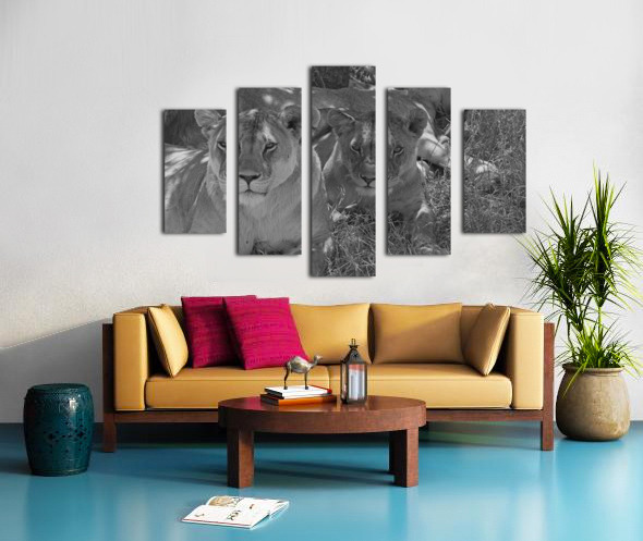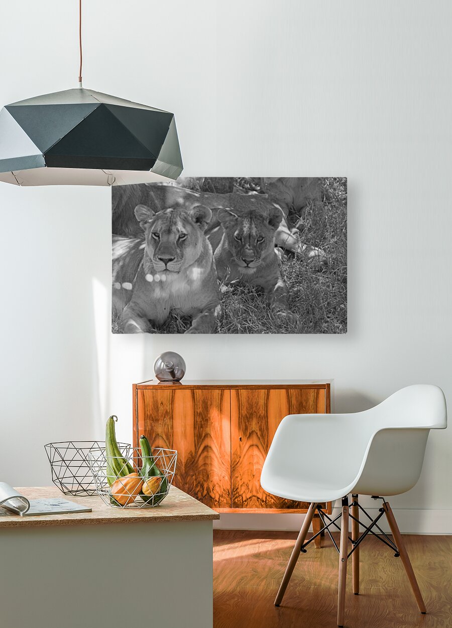 Two lionesses bask in the shade, their calm gaze revealing the quiet strength of Africa’s apex predators. This intimate portrait highlights raw majesty and feminine power—ideal for statement walls and wildlife-themed decor.