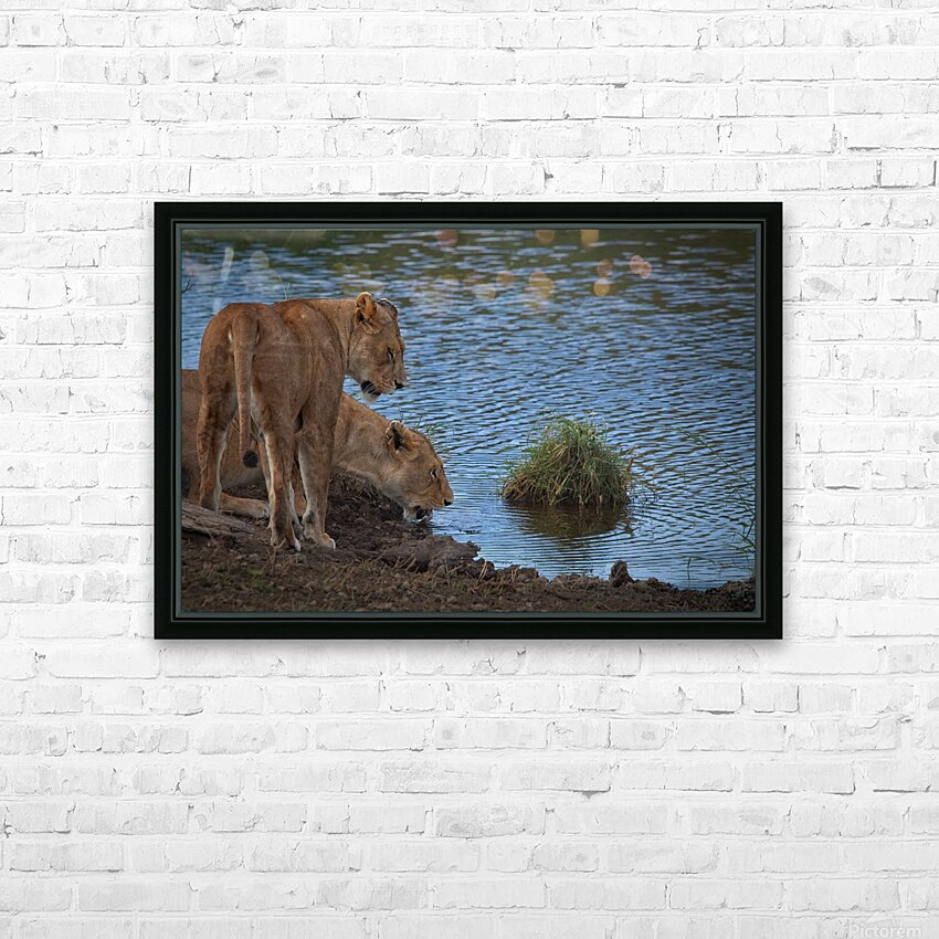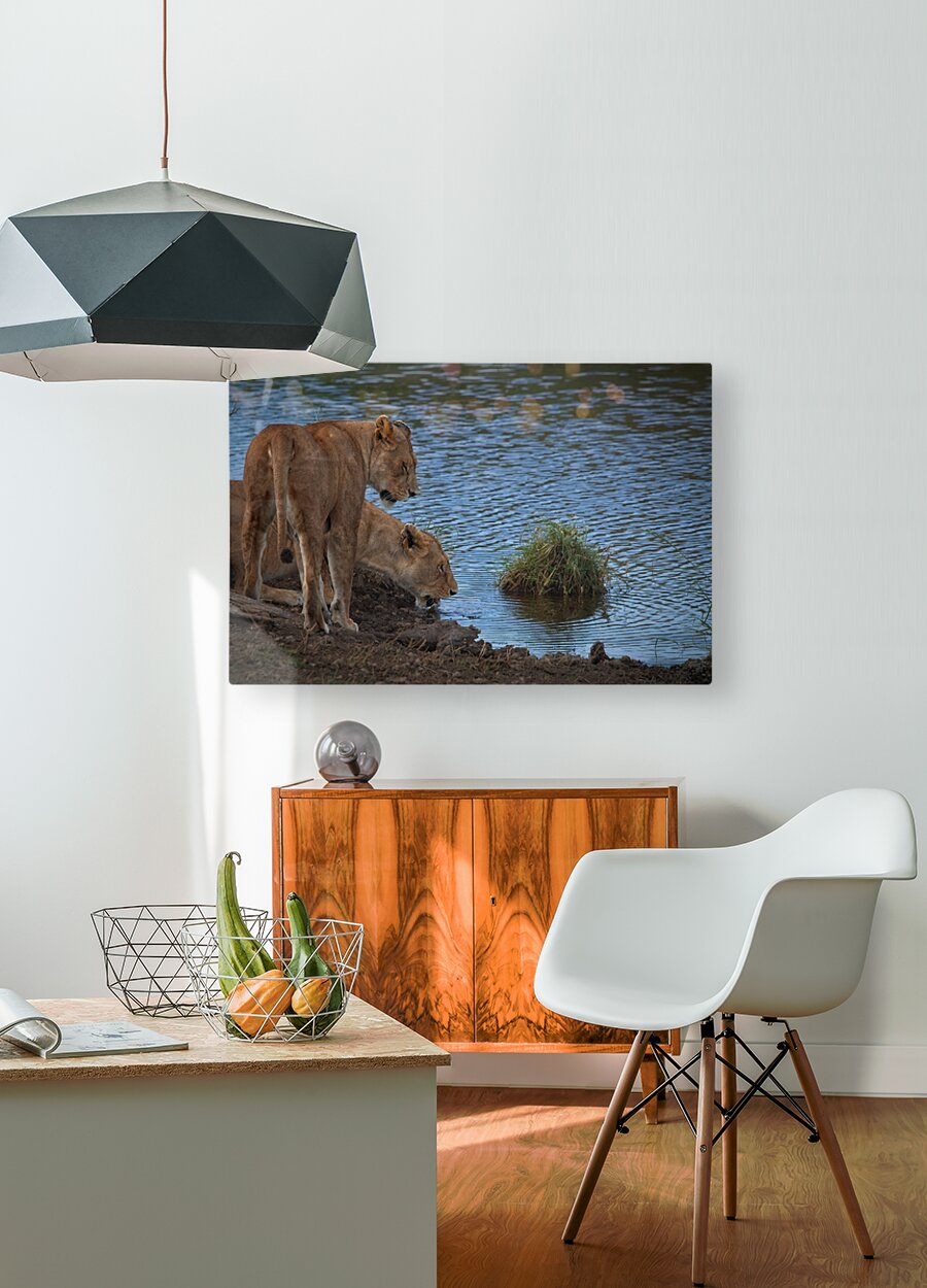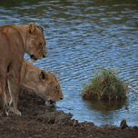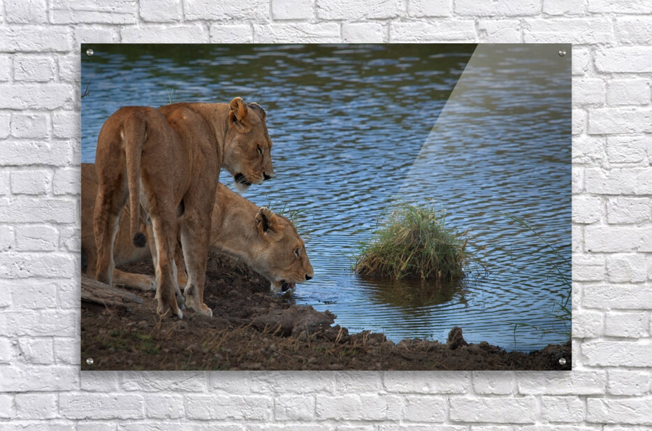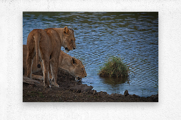 Lionesses lean forward with graceful intensity, drawn to the calm shimmer of the water.