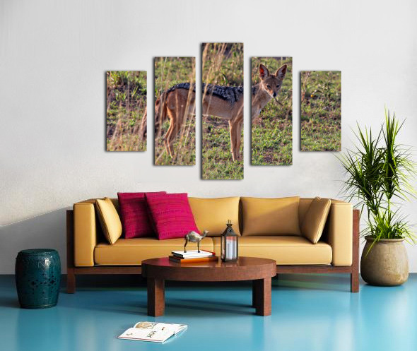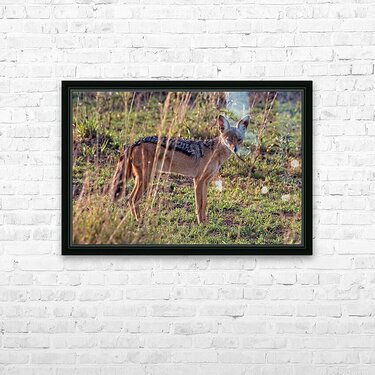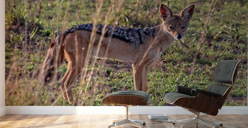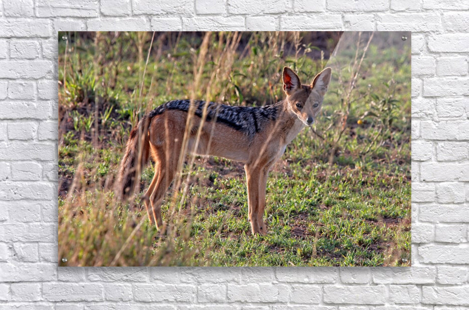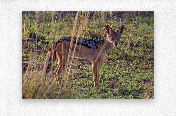 A jackal pauses mid-step, alert and elegantly poised in the tall grasses.