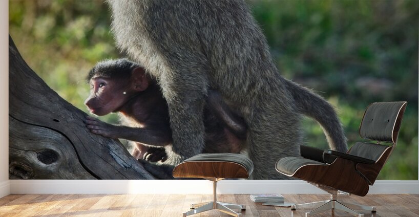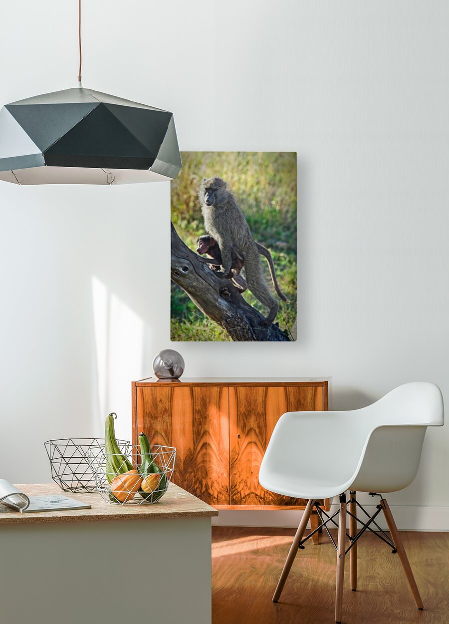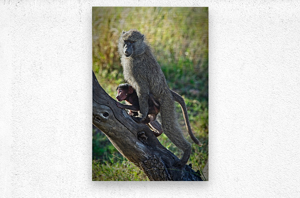 A baboon mother clings protectively to her infant as the pair navigates the branches, tenderness within the wild.