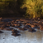 A dense gathering of hippos fills the river, their rounded backs surfacing like living boulders in the warm light.