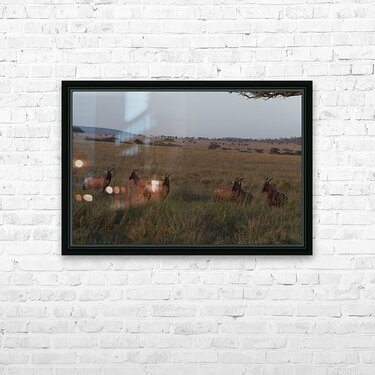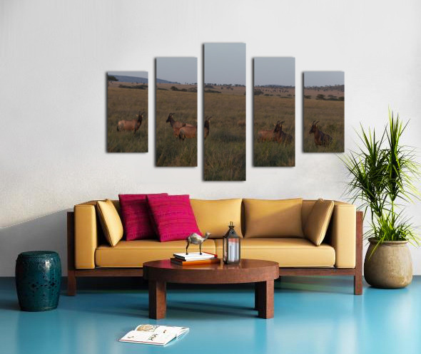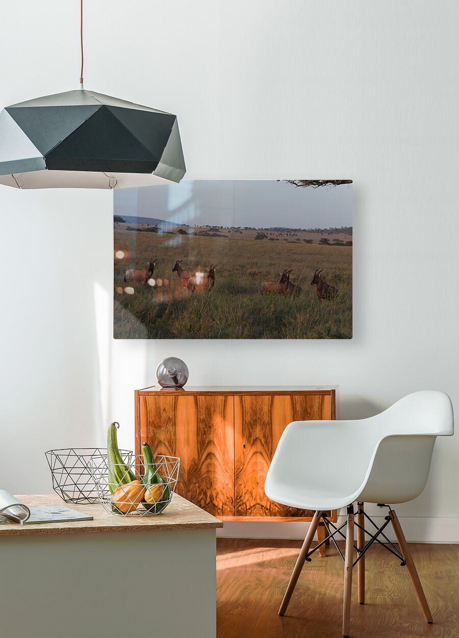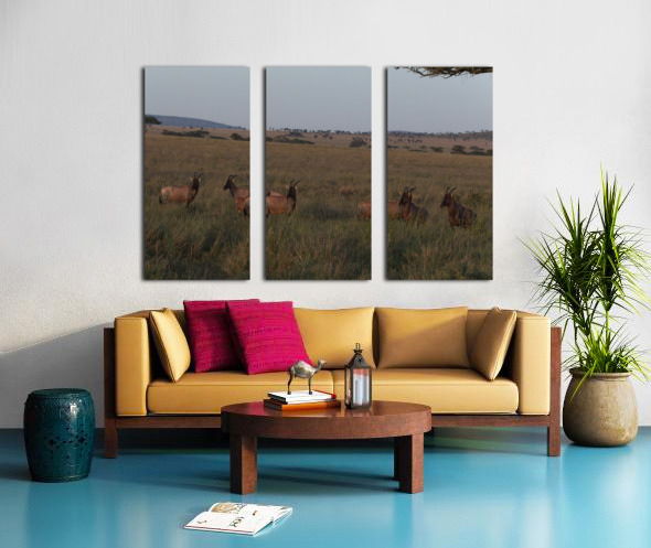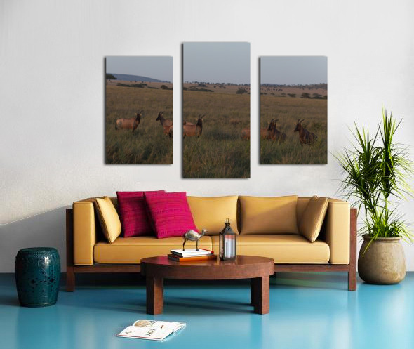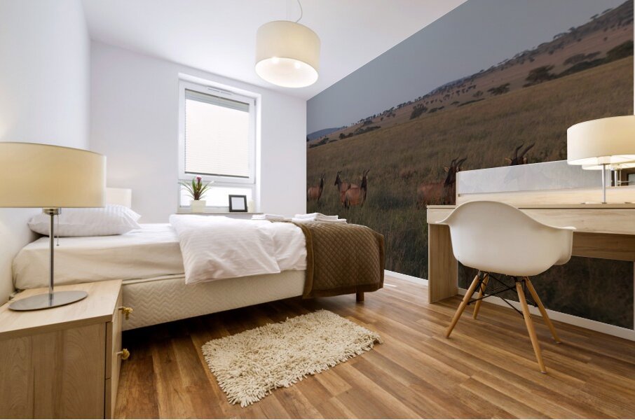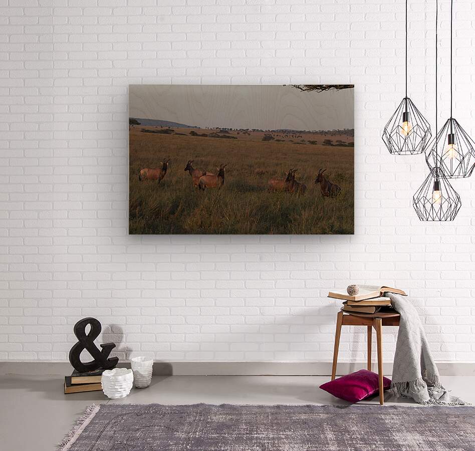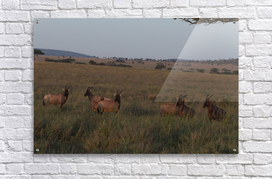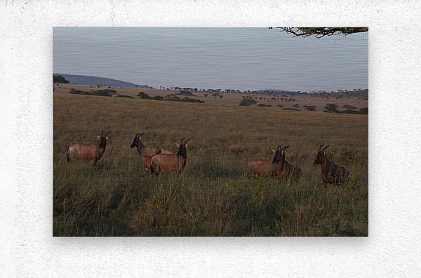A small group of topi antelopes surveys the vast savanna, their posture calm yet vigilant.