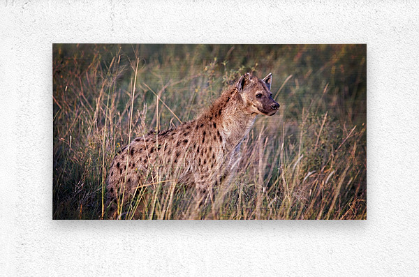 A hyena stands alert in the tall savanna grasses, scanning the horizon as dusk settles over the plains.
