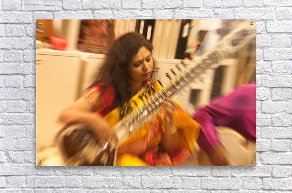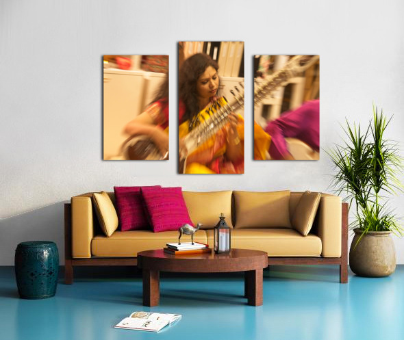 This vibrant image captures the energy of live music through soft blur and warm color. The musician’s focused expression and flowing motion make the scene feel alive and full of rhythm. It’s a lively, artistic piece that brings movement and joy to any space.
