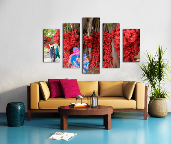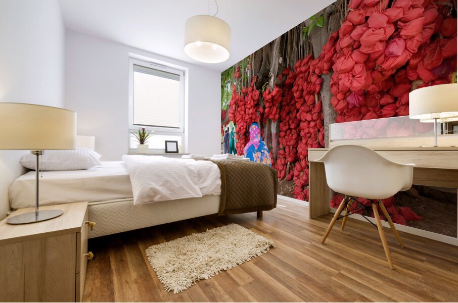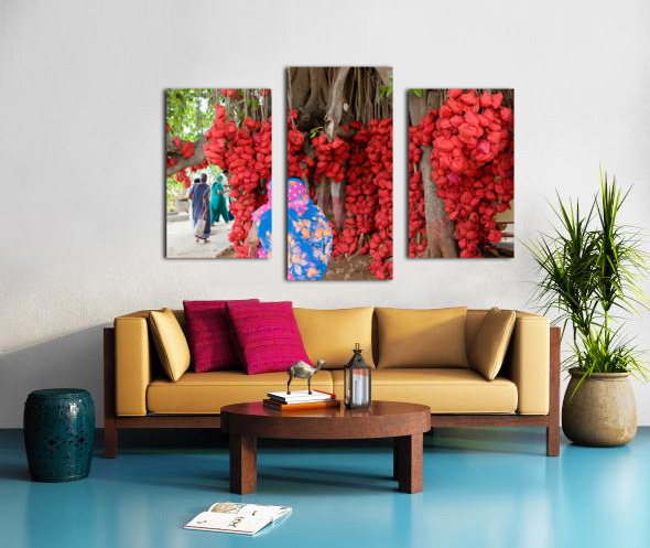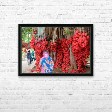 This colorful scene shows hundreds of bright red cloth bundles hanging from the branches of an old tree — a beautiful tradition of hopes, prayers, and memories. The vibrant colors and gentle movement of people around it create a warm, uplifting atmosphere. It’s a unique, eye-catching piece full of meaning and charm.