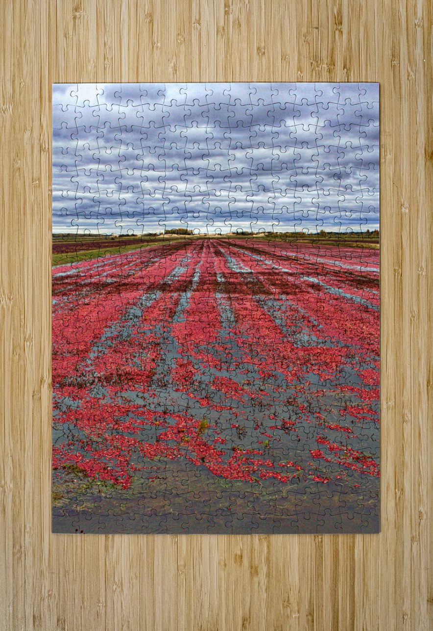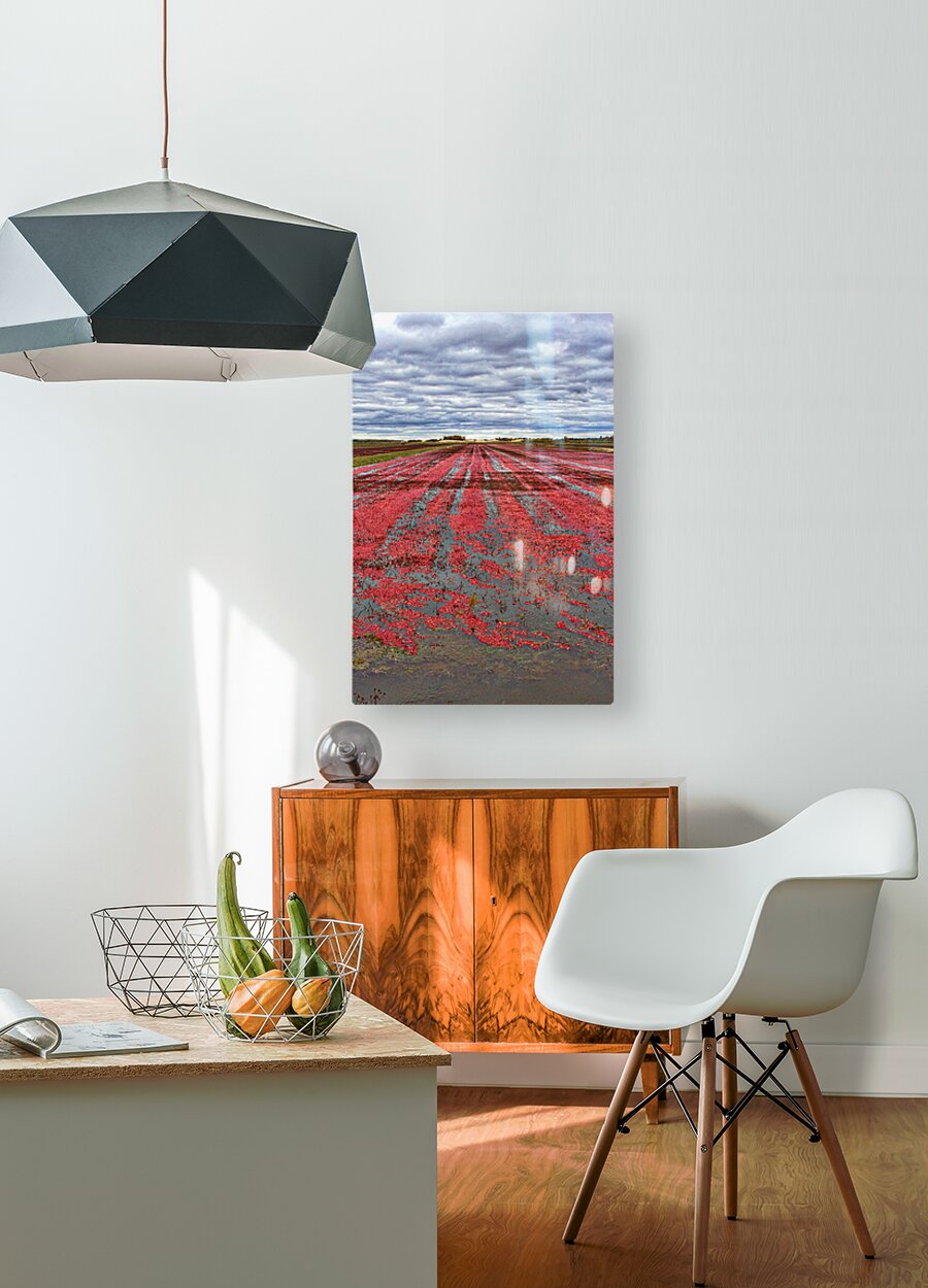 Vibrant red cranberries float across a flooded field under dramatic autumn skies—an unexpected and striking slice of rural beauty. A bold statement piece for modern kitchens, dining rooms, or creative workspaces, adding rich color and a unique story to any wall.