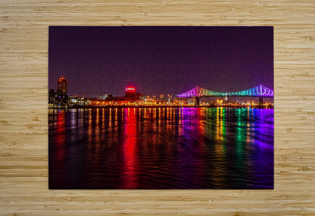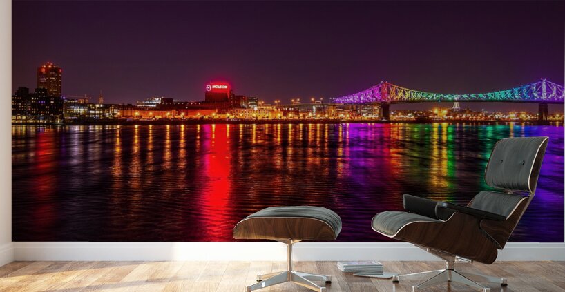Montreal’s skyline reflects across the St. Lawrence as the Jacques Cartier Bridge lights up the night in dazzling colors. A striking piece for offic...[+]