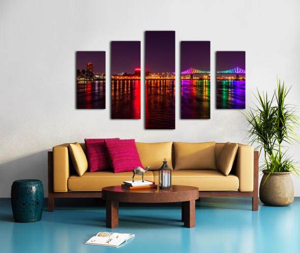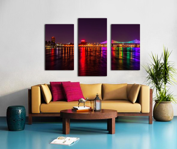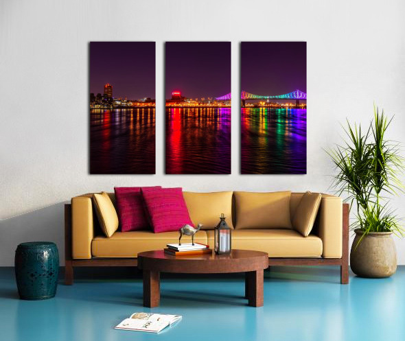 Montreal’s skyline reflects across the St. Lawrence as the Jacques Cartier Bridge lights up the night in dazzling colors. A striking piece for offices, lounges, bedrooms, or entryways—ideal for anyone who loves urban style with a touch of magic.