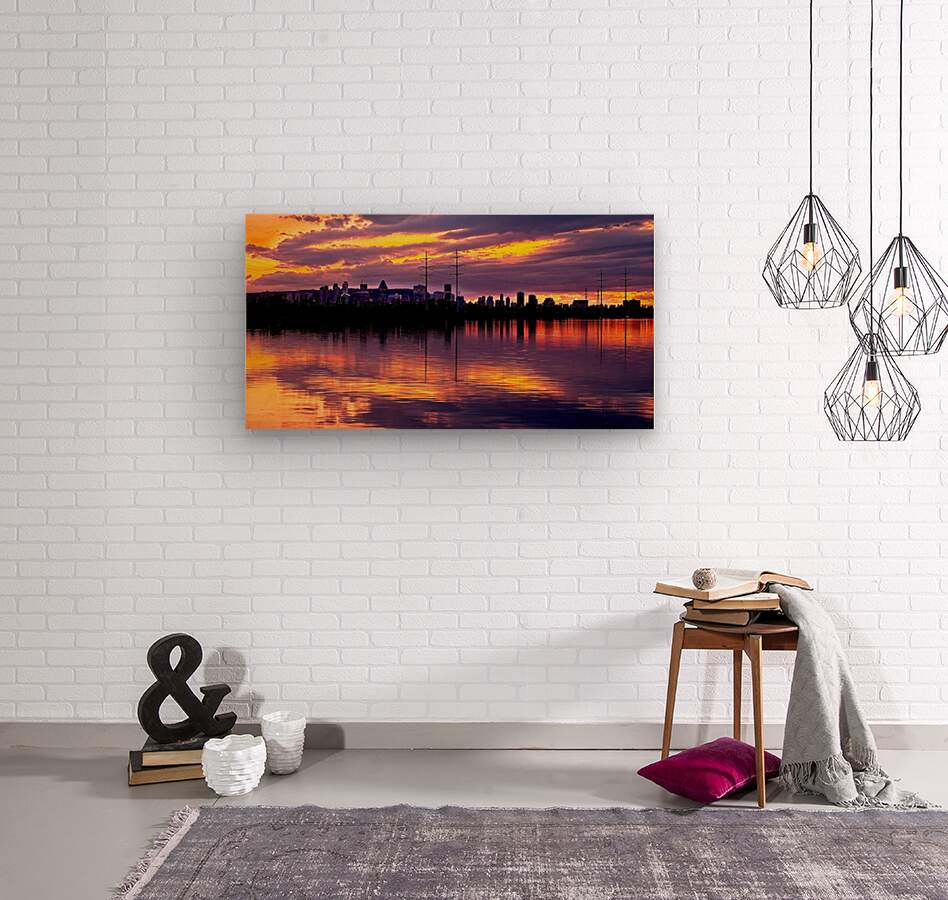 A dramatic Montreal skyline glows against a fiery sunset, mirrored perfectly on the water. This bold, modern piece brings energy and color into any living room, office, or creative workspace.