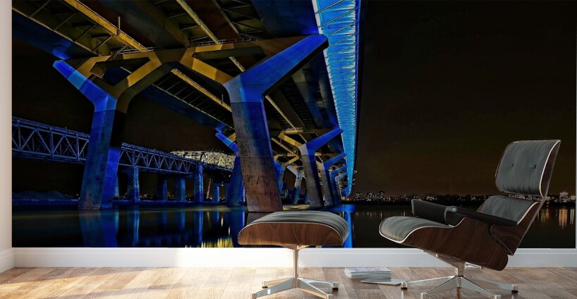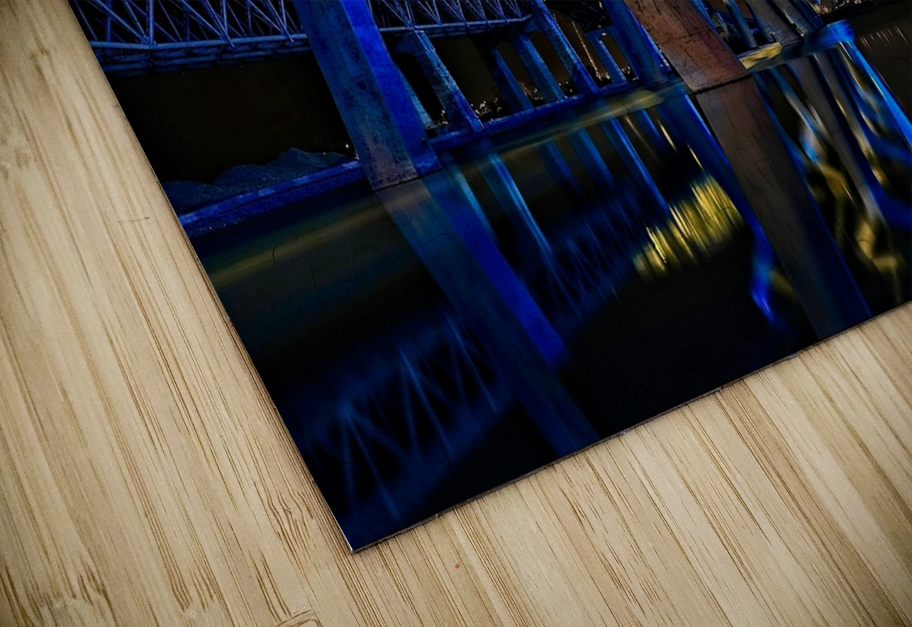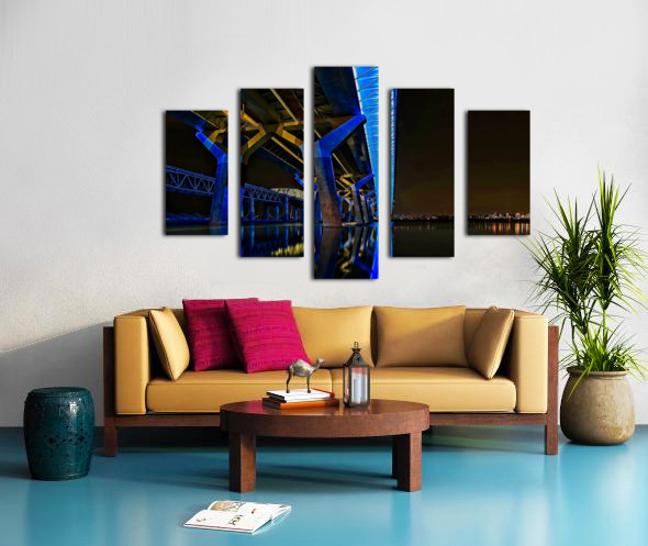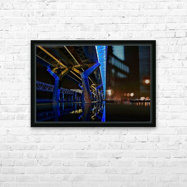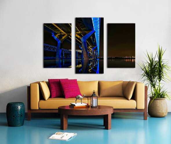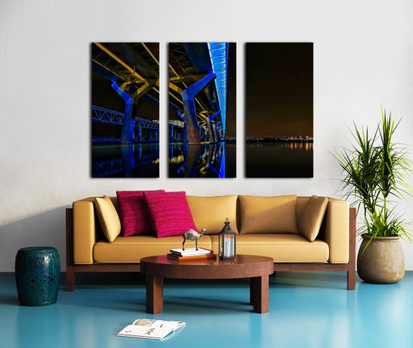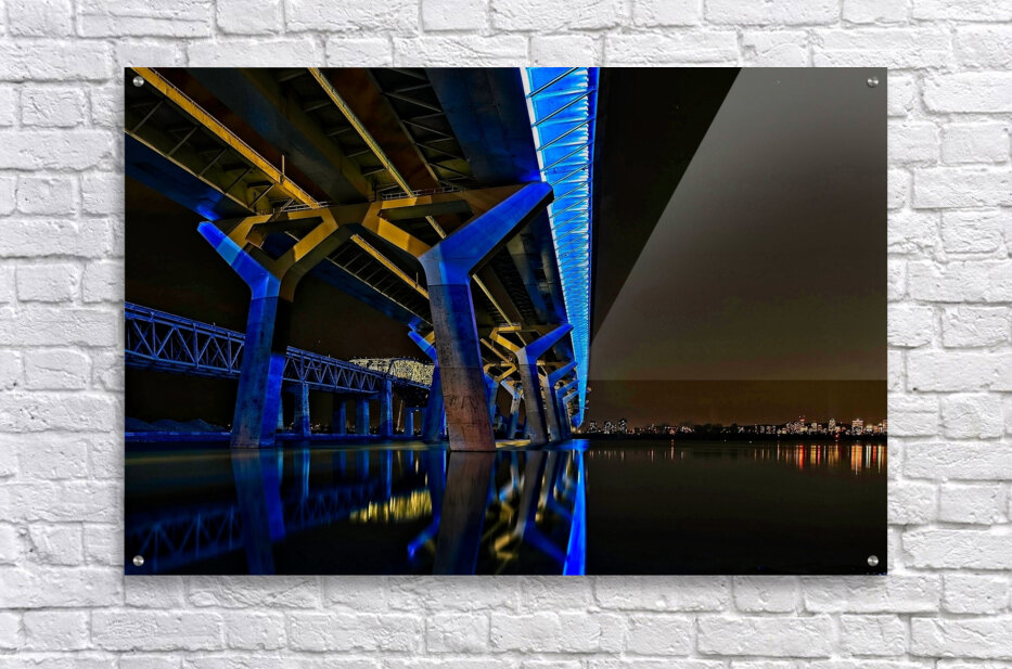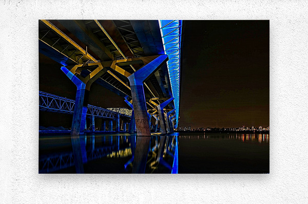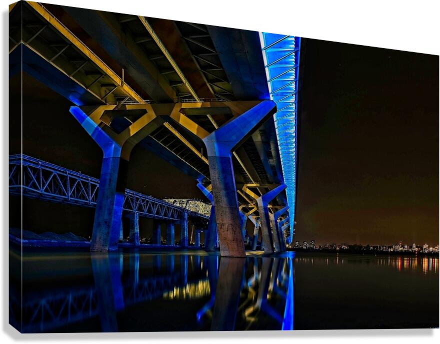 This striking nightscape captures Montreal’s Champlain Bridge glowing in bold blue and gold, reflected perfectly on the still surface below. The modern lines and vibrant colors bring instant energy to any room—perfect for offices, studios, contemporary living spaces, or anywhere you want a touch of urban sophistication. A standout piece for anyone who loves architecture, Montreal, or dramatic nighttime photography.
