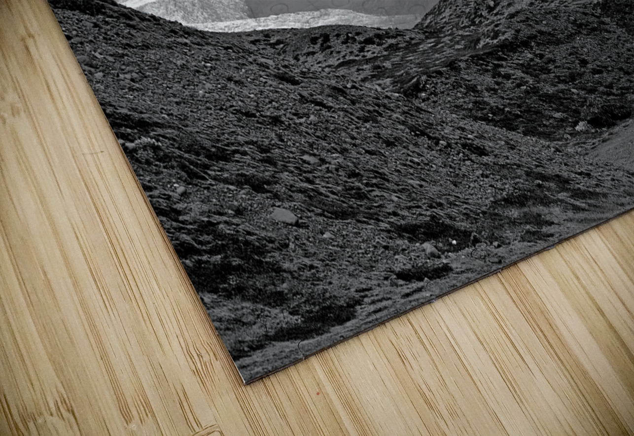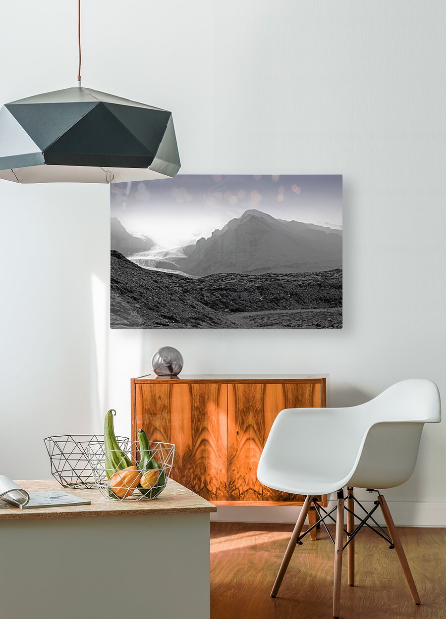 A glacier stretches through shadowy mountains in this haunting monochrome scene. Cool, ethereal, and cinematic — perfect for collectors drawn to remote, dramatic natural landscapes.