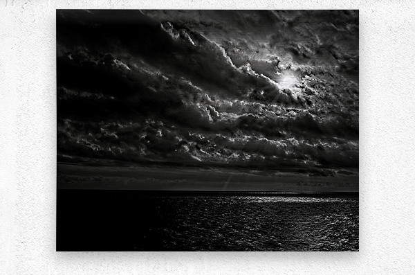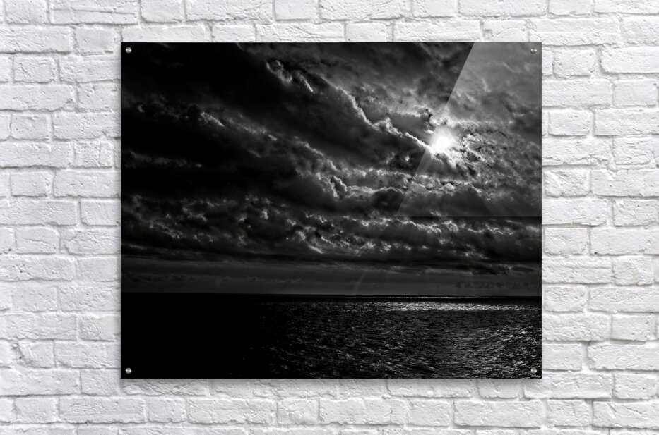 A dramatic black-and-white seascape where sunlight battles through turbulent clouds, illuminating the water below. Bold, moody, and unforgettable — perfect for collectors who love high-contrast fine art.