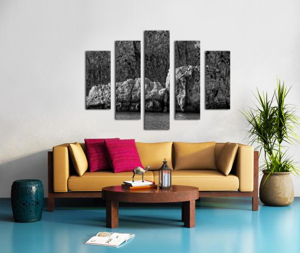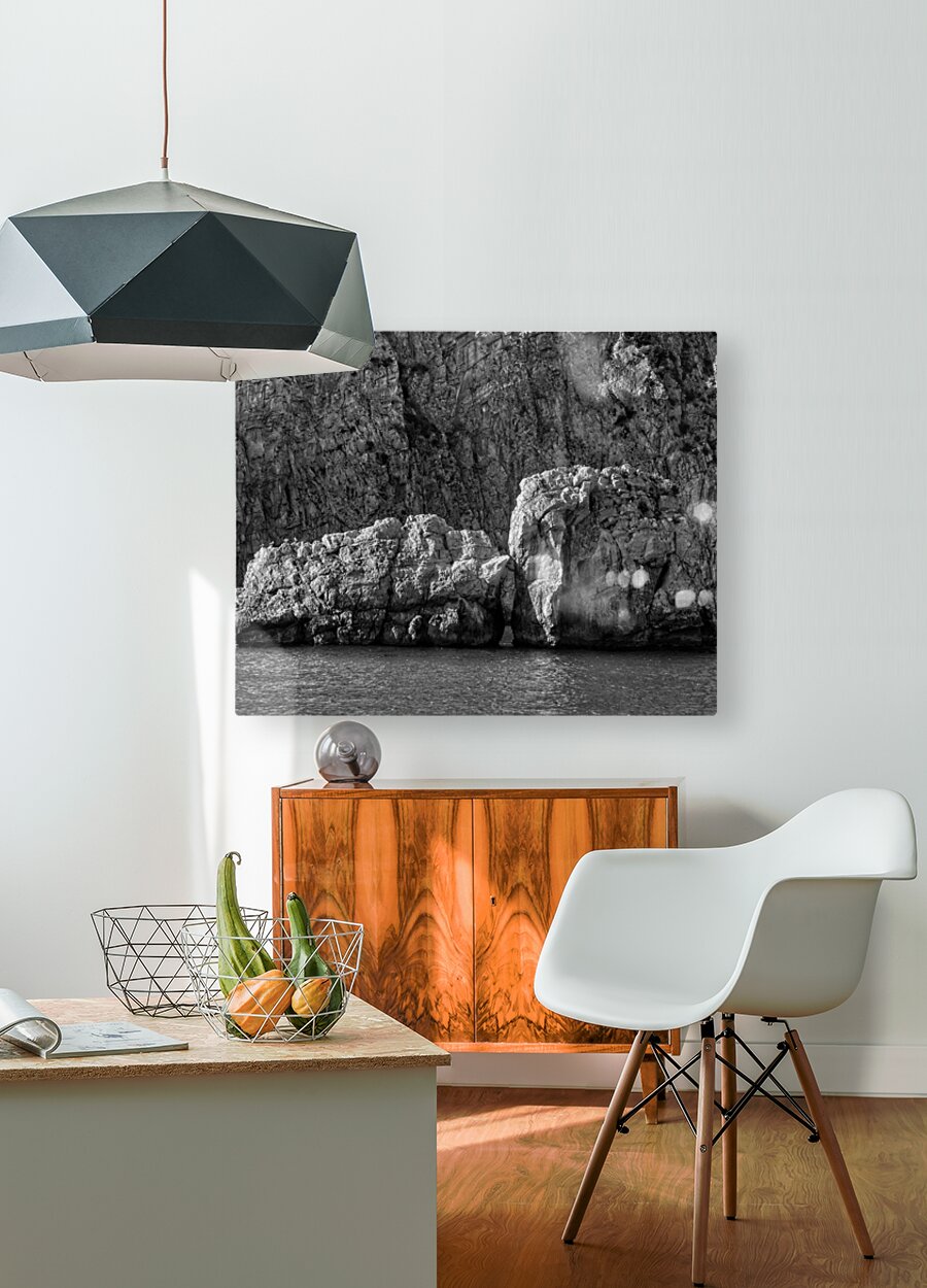Massive cliffs and rugged rock formations stand guard over calm water. This monochrome image adds strength and character to any space—quietly powerful and endlessly fascinating.