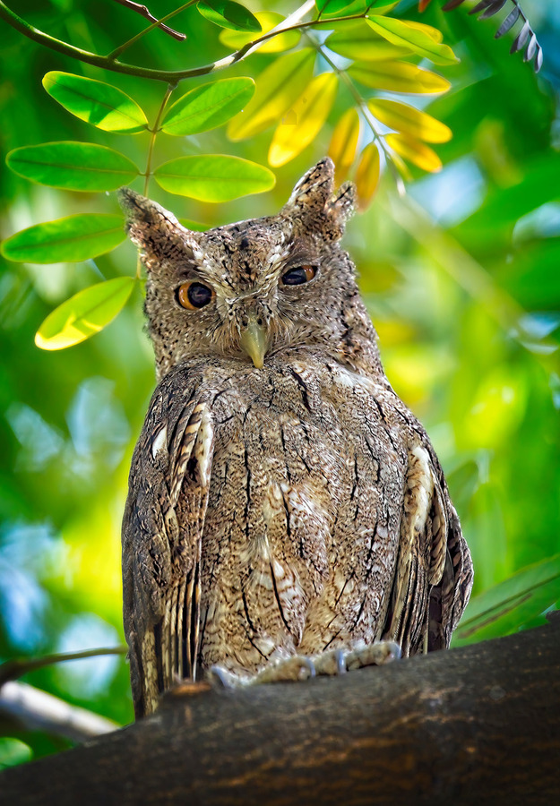 Nestled among glowing greens, the owl stands poised and contemplative. Its intricate markings and statuesque posture capture the timeless elegance of nature’s most enigmatic night wanderer.