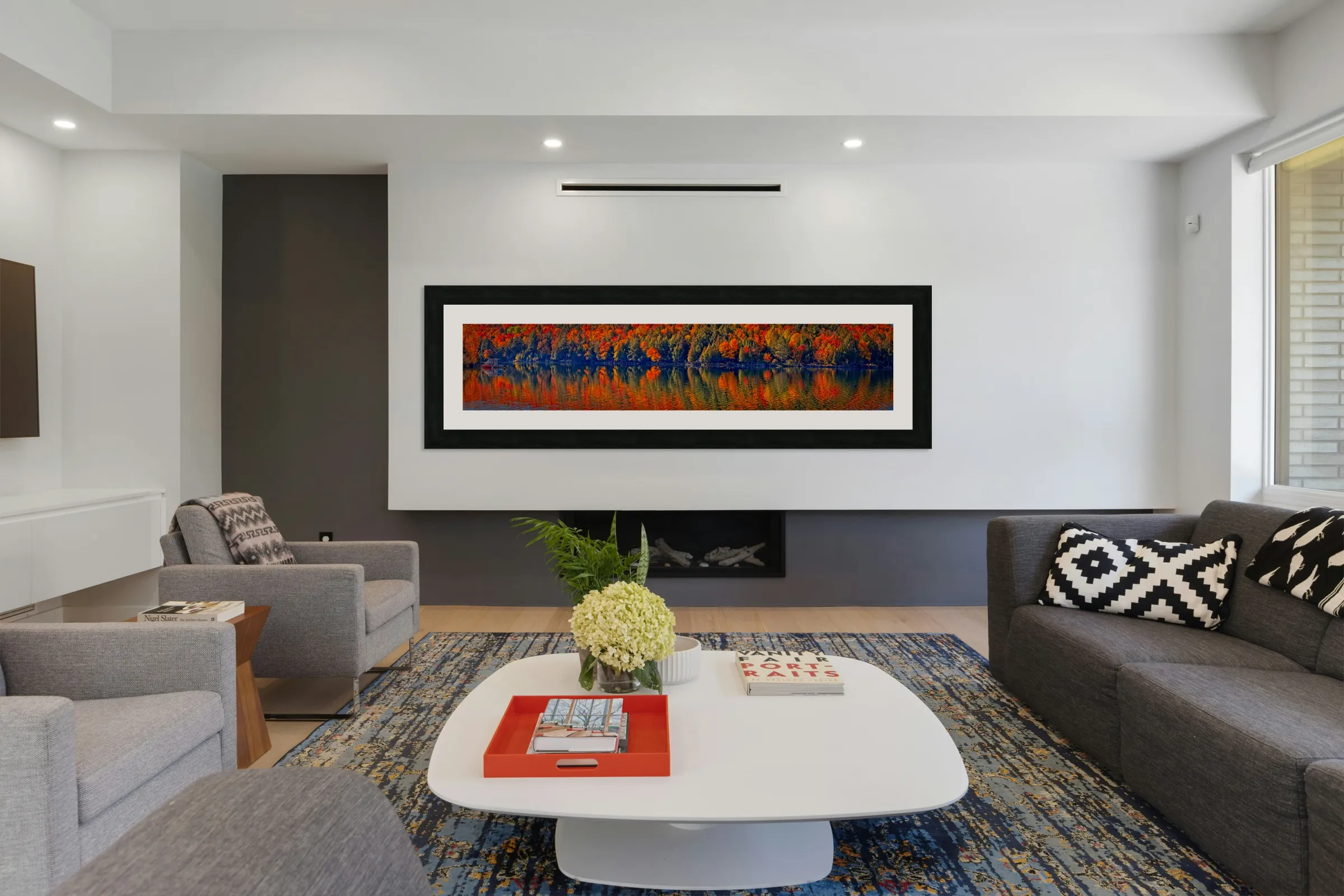 A breathtaking panorama of fiery autumn trees mirrored perfectly on still water. This artwork fills your space with warmth, texture, and the unmistakable glow of fall—ideal for creating an inviting, upscale atmosphere.