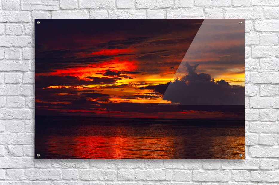 Deep crimson and fiery amber ignite the sky while their reflections ripple across the dark ocean surface. A dramatic, emotion-packed artwork that adds intensity and bold character to modern interiors.