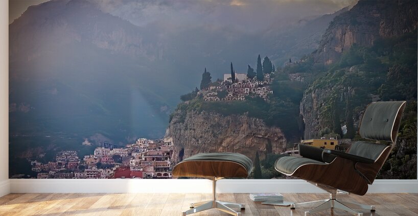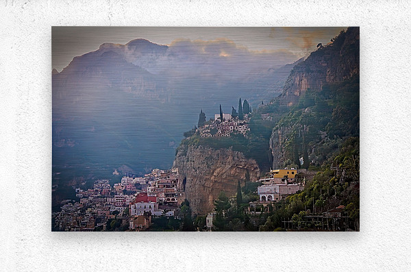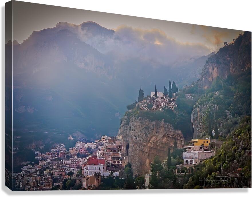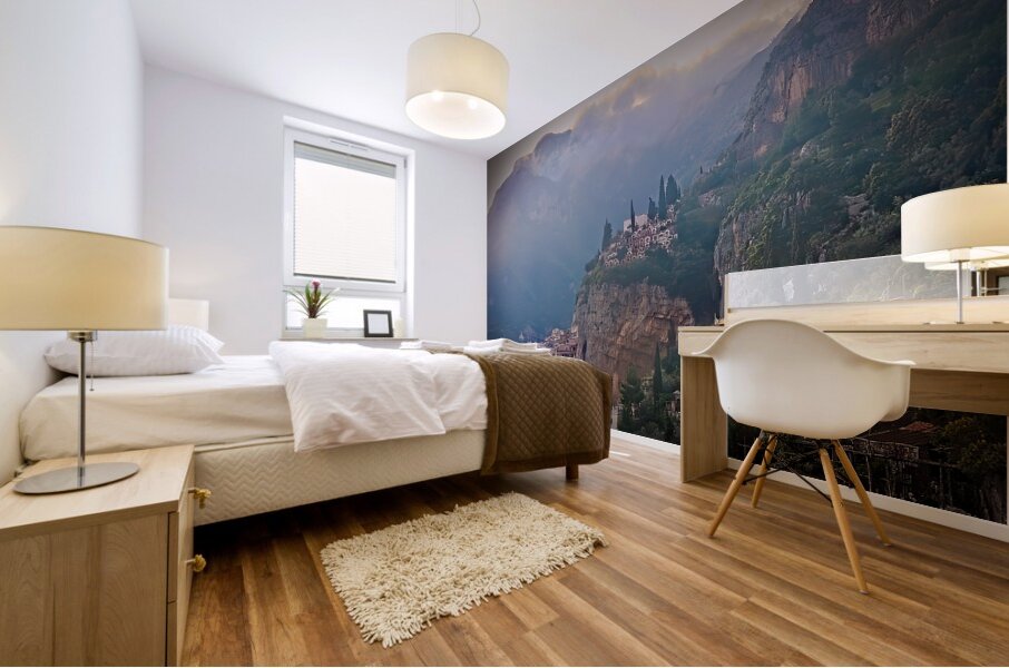 This scene feels dreamy and peaceful, with soft light drifting over hillside homes and distant mountains. The mix of mist, warm colors, and detailed architecture gives the whole image a quiet, magical charm. It’s a beautiful piece that adds depth, calm, and a sense of wonder to any space.