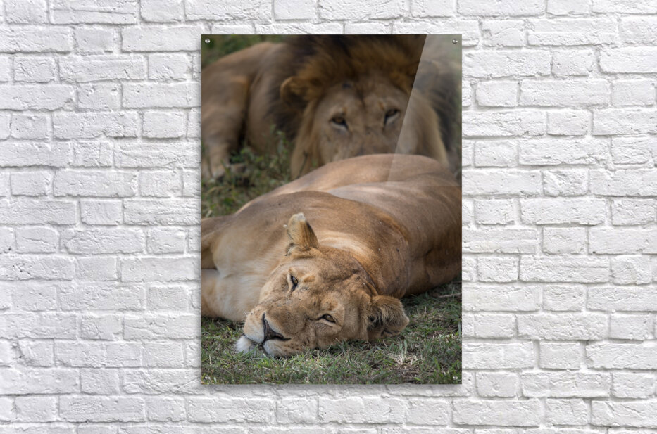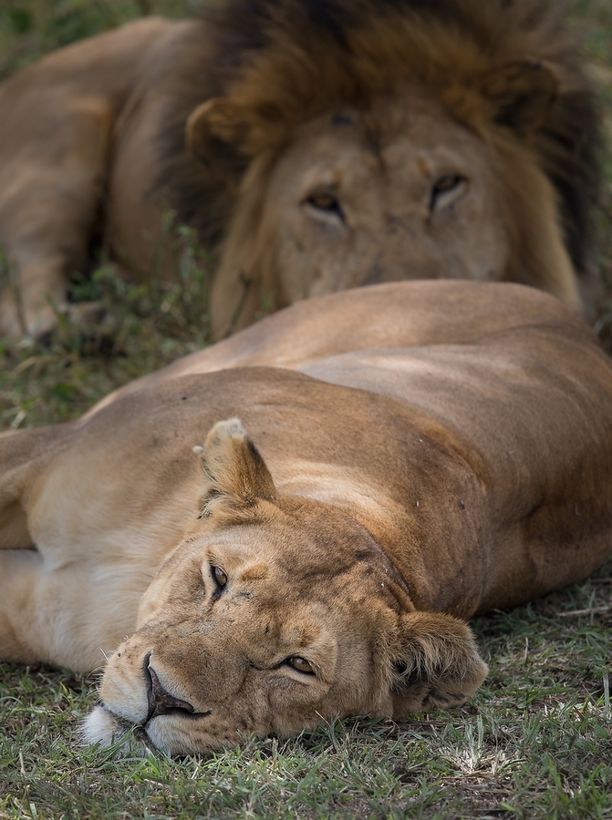 A lioness lounges peacefully in the grass while the watchful eyes of a male lion linger protectively behind her.
