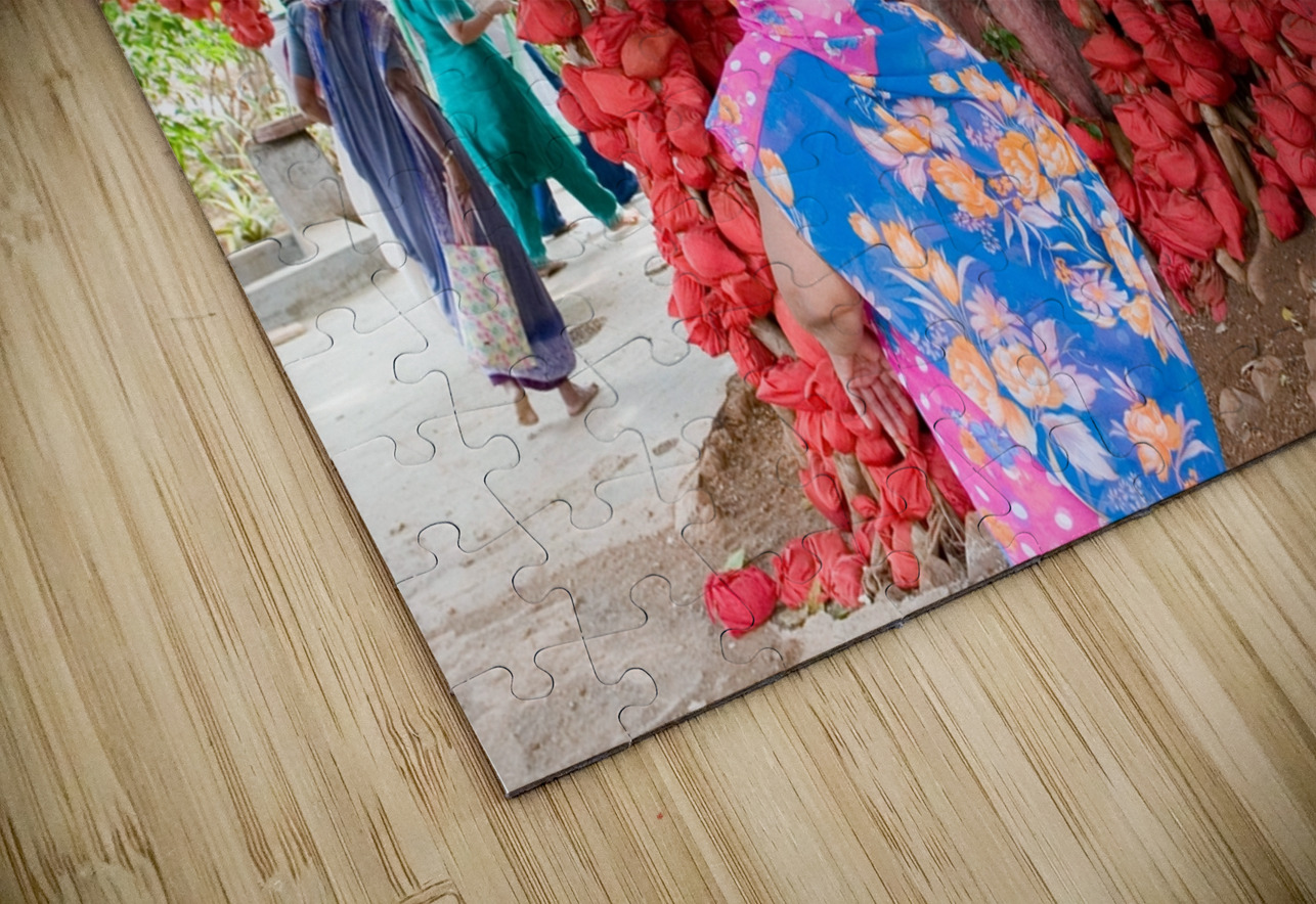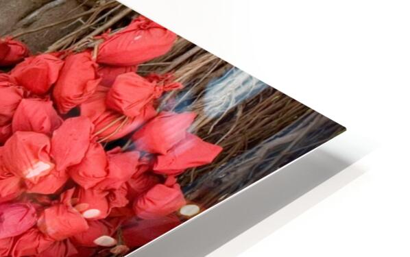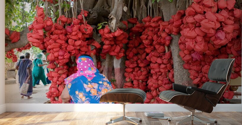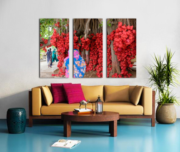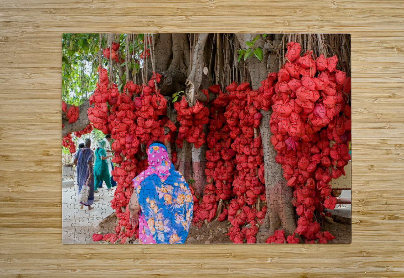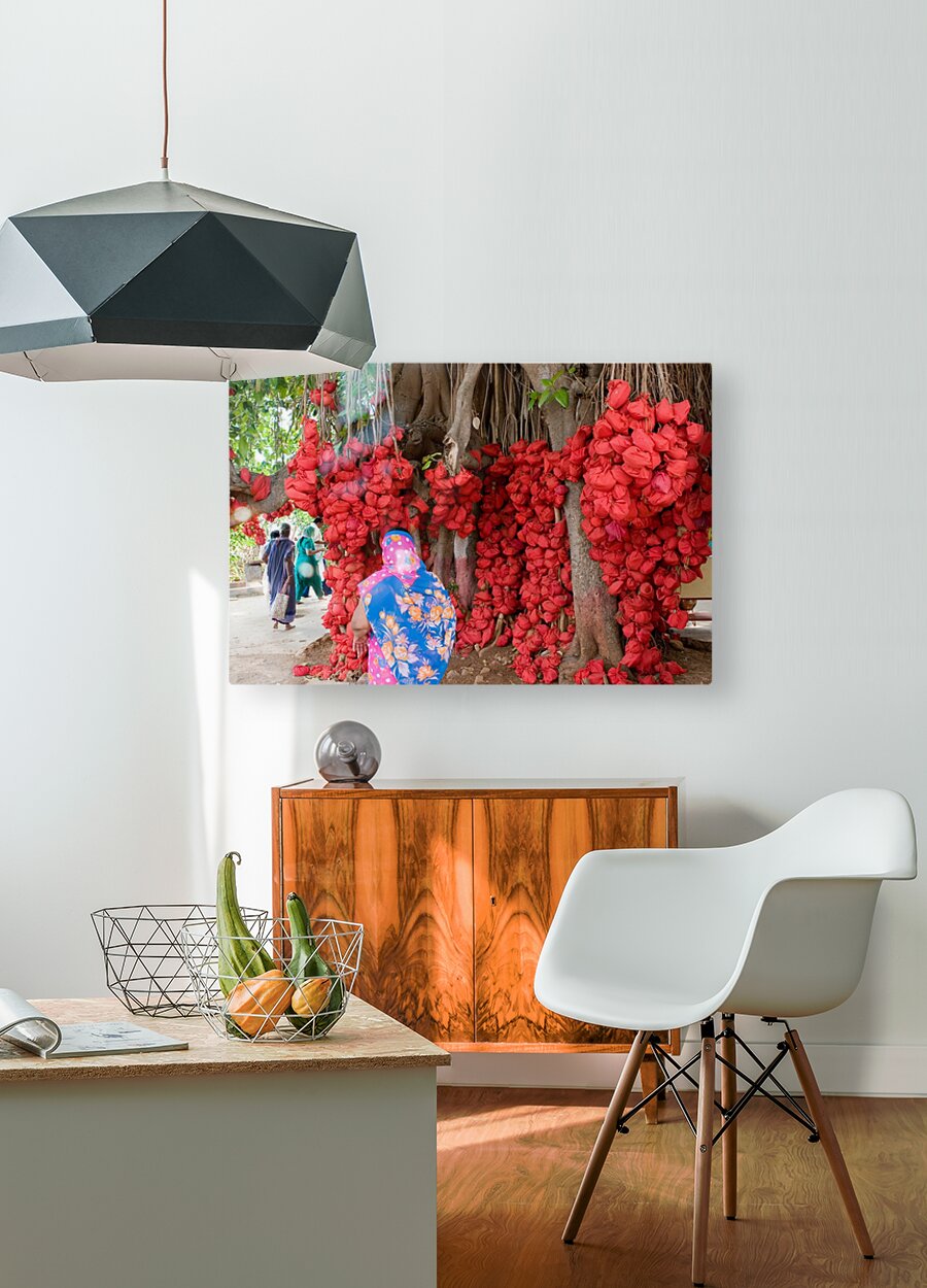 This colorful scene shows hundreds of bright red cloth bundles hanging from the branches of an old tree — a beautiful tradition of hopes, prayers, and memories. The vibrant colors and gentle movement of people around it create a warm, uplifting atmosphere. It’s a unique, eye-catching piece full of meaning and charm.