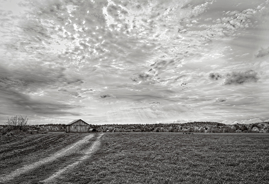 A lone barn rests beneath a breathtaking sky filled with textured clouds and streaming light. This peaceful countryside composition brings warmth and ...[+]