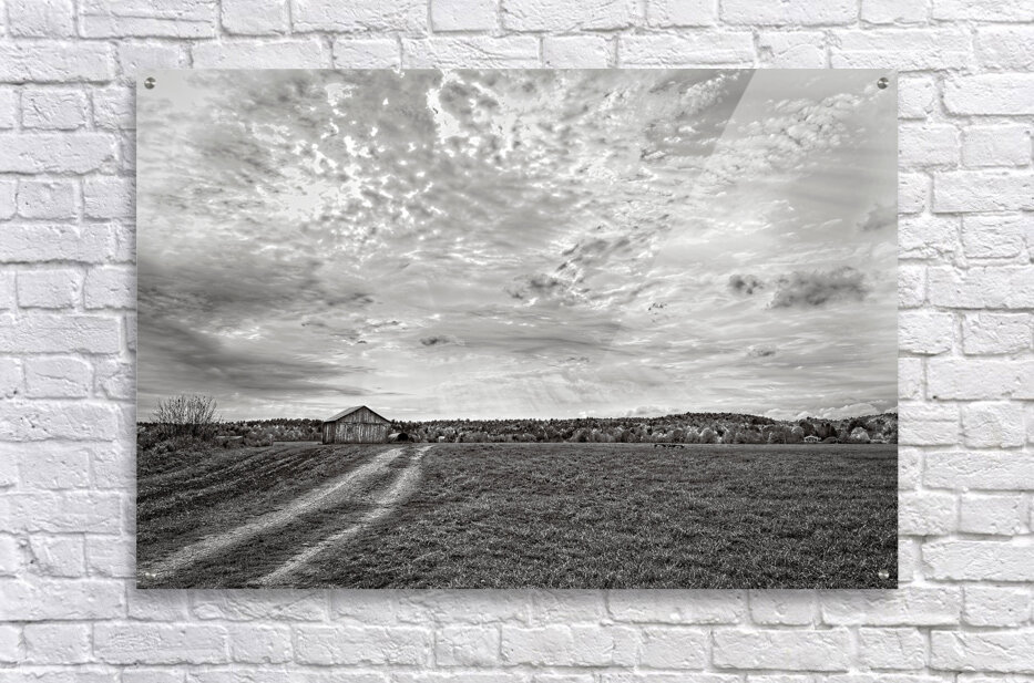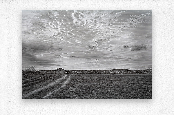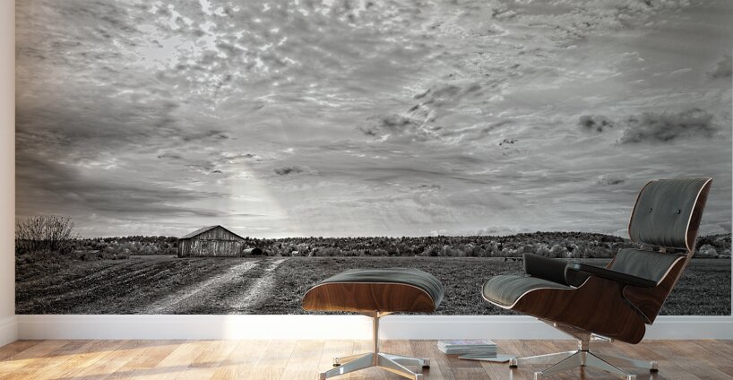 A lone barn rests beneath a breathtaking sky filled with textured clouds and streaming light. This peaceful countryside composition brings warmth and nostalgia into any living space.